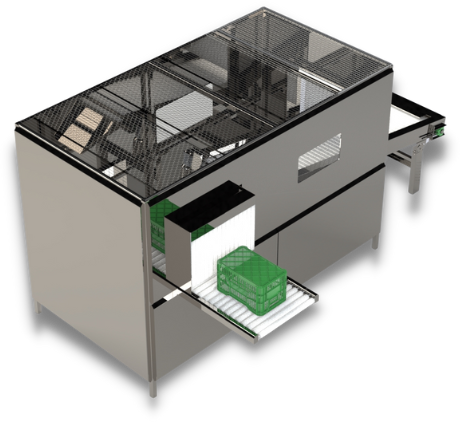 It automates the turning of boxes by rotating them slowly and maintains a feeding rate of 18 to 30 boxes/minute, with box exit by means of a roller conveyor.