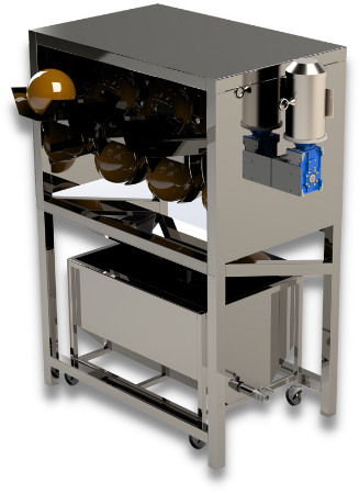 The IBE SOLUTIONS coconut slicer is composed of a toothed belt system that aligns the fruit towards a block of blades. The transport system is rotating and, thanks to the shape of the rails, the products are aligned during transport to be subsequently cut in half to extract the water.